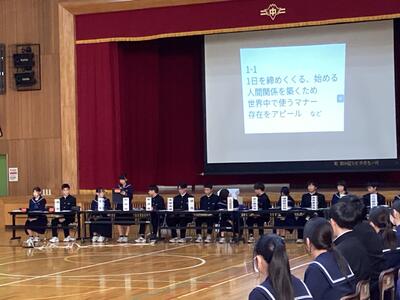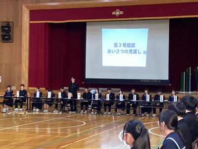 第3号議案では、執行部から「あいさつの見直し」というテーマで話し合いがなされました。各クラスで考えたあいさつの意義の発表や、朝の挨拶場面の動画視聴を通し、自分のあいさつを見直しました。声の大きさだけでなく、相手と目線を合わせること、笑顔で挨拶すること、等の意見を確認し、学校全体で挨拶の質を高めていこうと締めくくりました。