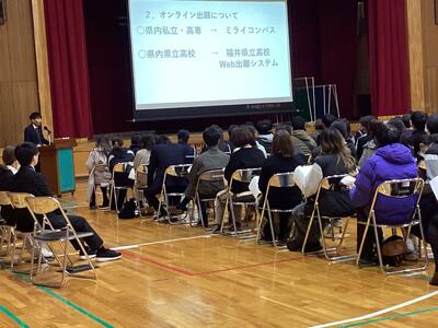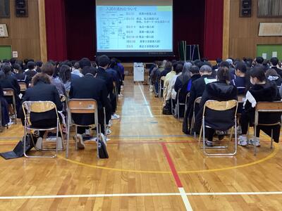 11月21日(金)午後、体育館にて進路説明会を行いました。生徒は保護者と一緒に、今年度の入試制度、受験までの流れや出願方法などの説明を受けました。生徒も保護者の皆さんも担当の先生からの話を、メモを取りながら真剣に聞いていました。