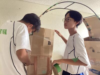 「装飾部門」では、テーマ『我武者羅』に沿った大きな看板や色ごとの装飾、アーチなど、チームに分かれて取り組み、少しずつ形が見えてきました。
