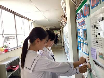足羽中の職員室前の掲示板に、ALTの英語コーナーがあります。