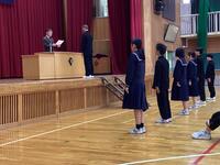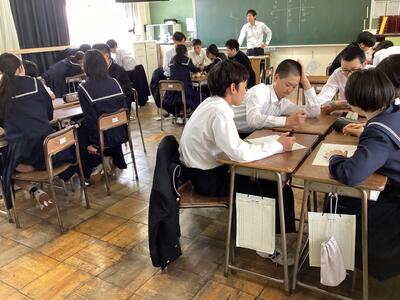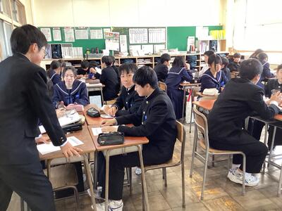 最後に、下の写真は、3年生のあるクラスの様子です。3限目ですが、すでに配膳台が設置されていました。3・4限目連続で体育・理科と移動教室ということで、給食がスムーズに準備できるようにしてありました。学級長の呼びかけや給食委員の気付きが素晴らしいです。さすが3年生!。