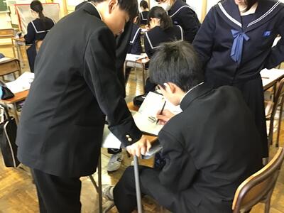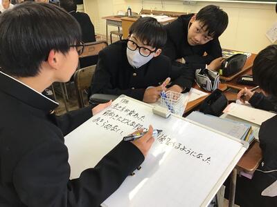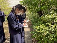 足羽中の中庭=ビオトープに出向いて、いろいろな植物や生物を観察しました。穏やかな日差しの中、開放感いっぱいに学んでいました。ノートを見せてもらうと・・・「小学生の時より、ノートを丁寧に書いている」と言っていました!