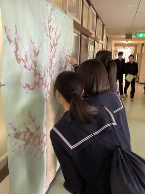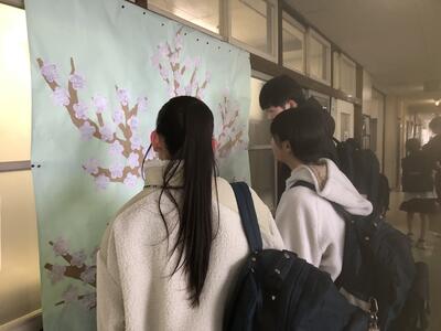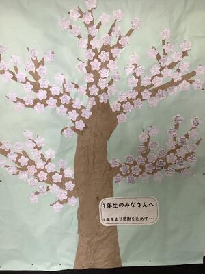 生徒玄関前に、大きな桜の木が描かれた掲示物が飾られました。花びらには、1年生一人一人が3年生の先輩に向けて書いたメッセージが貼られています。
