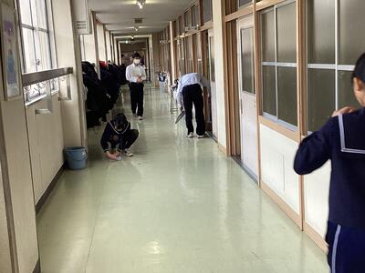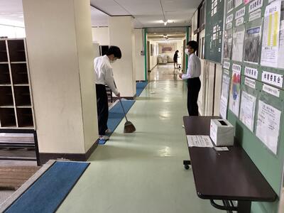 各清掃場所を美化委員が点検し、おしゃべりがないか・隅々まで掃除できているかなどをチェックしました。掃除後は、美化委員が今日の掃除の点数と、良かった点・悪かった点を伝えました。