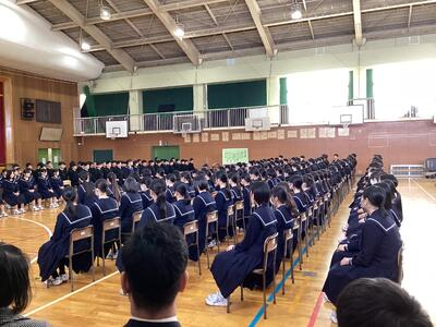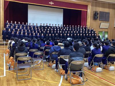 ・先輩の校歌や合唱をする声が、とても大きくきれいですごいと思いました。また、指揮をしている人がとても上手で、いろいろな表現をしていていいなと思いました。先輩の中で「笑顔を忘れない」と「自分の行動に責任を持つ」が特に私の心に響きました。