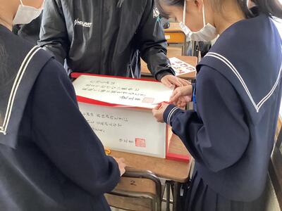 校歌披露では、「中学校の校歌はこうなんだな。」を超えて「この校歌を先輩たちと歌いたい!」と思ってもらえるように、と気合を入れて歌いました。緊張感いっぱいの中での披露になりましたが、精一杯の歌声が6年生にも届いていました。