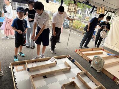 総合科学部は、ロボットを操作しながらコースを回る体験コーナーを出店しました。今年は、子供用と大人用の2種類のコースをつくり、大人用はジャンプ台も設置しました。ゴールするとお菓子の景品がもらえました。ロボット好きの小学生や中学生に好評でした。