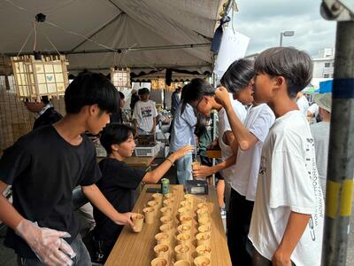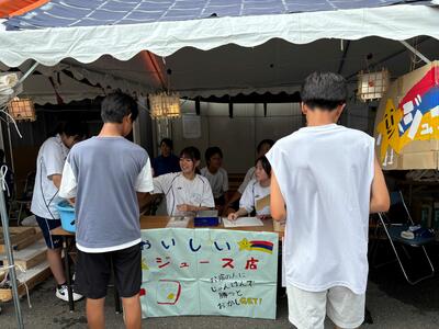 執行部は、ジュース販売。今年は、懐かしいラムネも準備し、猛暑の中、次々とお客さんが来店していました。購入した方との恒例のじゃんけんタイムでは、執行部の生徒と勝負し、生徒に勝つとお菓子を渡していました。執行部の負け越しだったので、皆さんにおおいに喜んでもらえました。