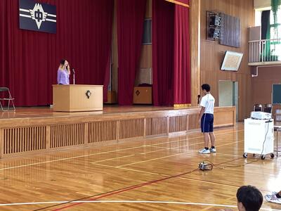 全校集会では、新たに赴任したALTの紹介を行い、生徒会長から歓迎の言葉を贈りました。ALTからも挨拶の中でオススメの映画や本など教えてほしいという話があったので、ぜひ気軽に話しかけてほしいと思います。